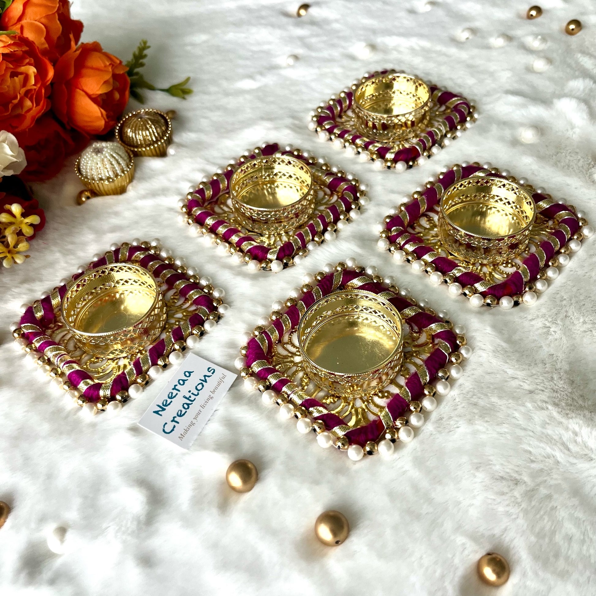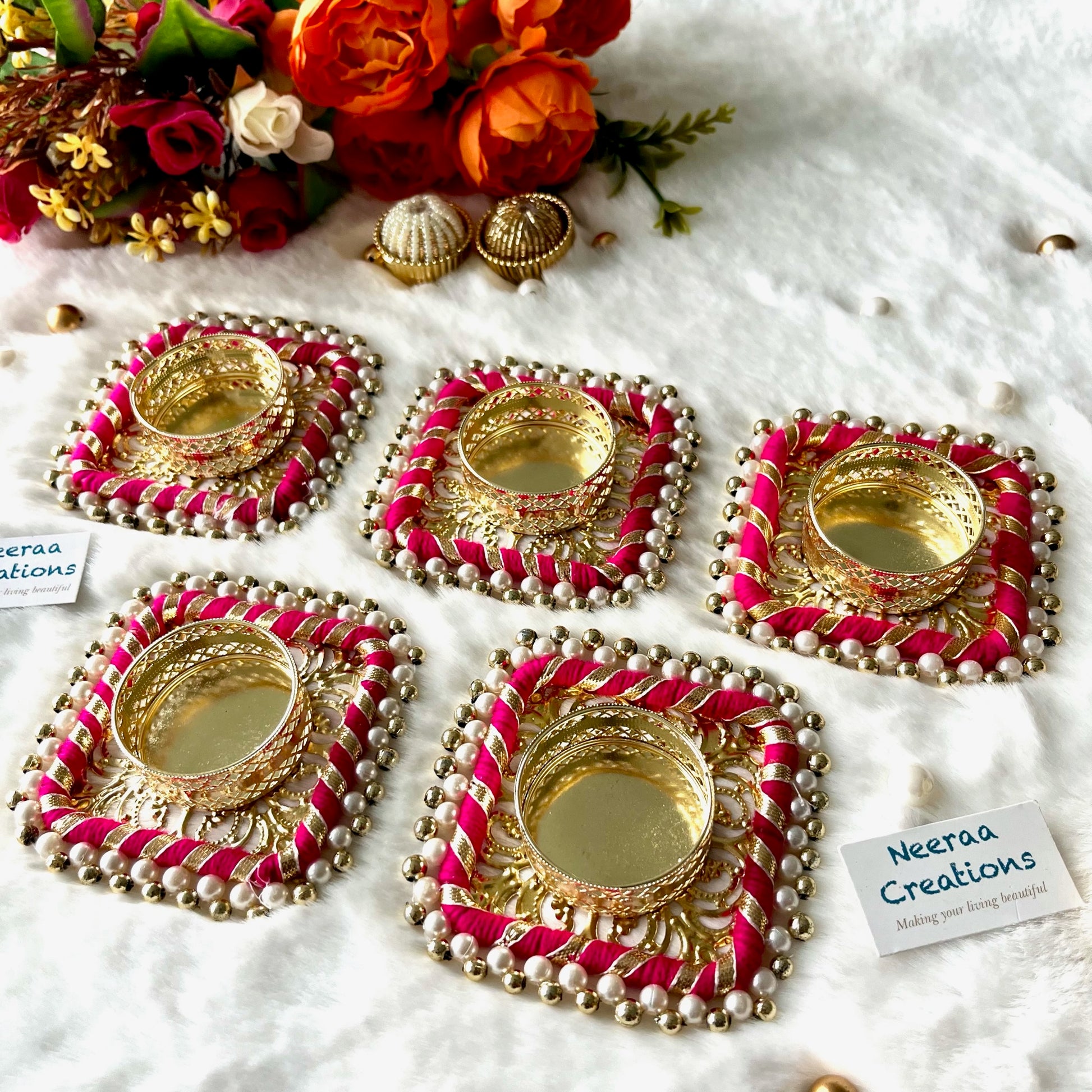 This set is adorned with Gota, Thread, Metal Tealight holder etc.
