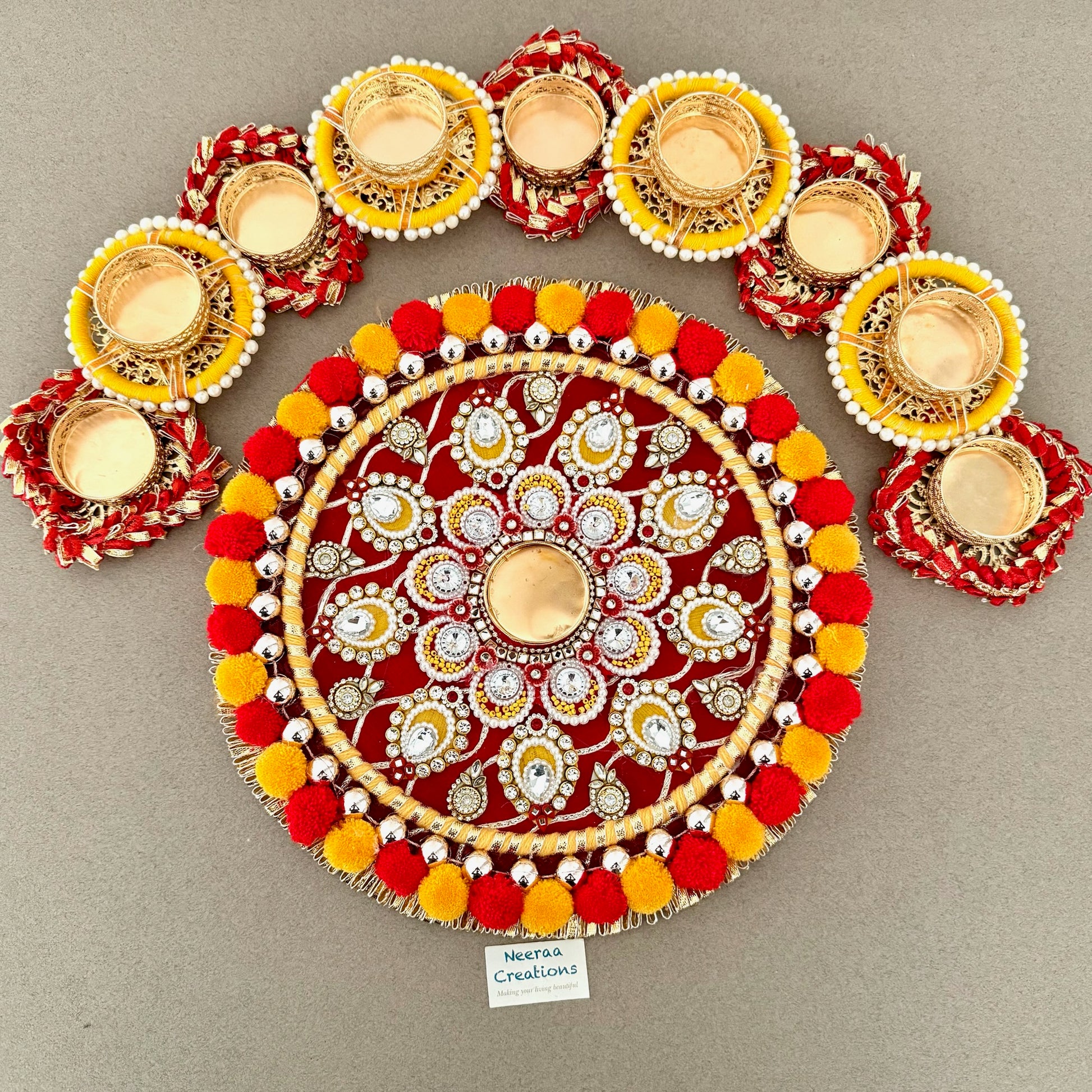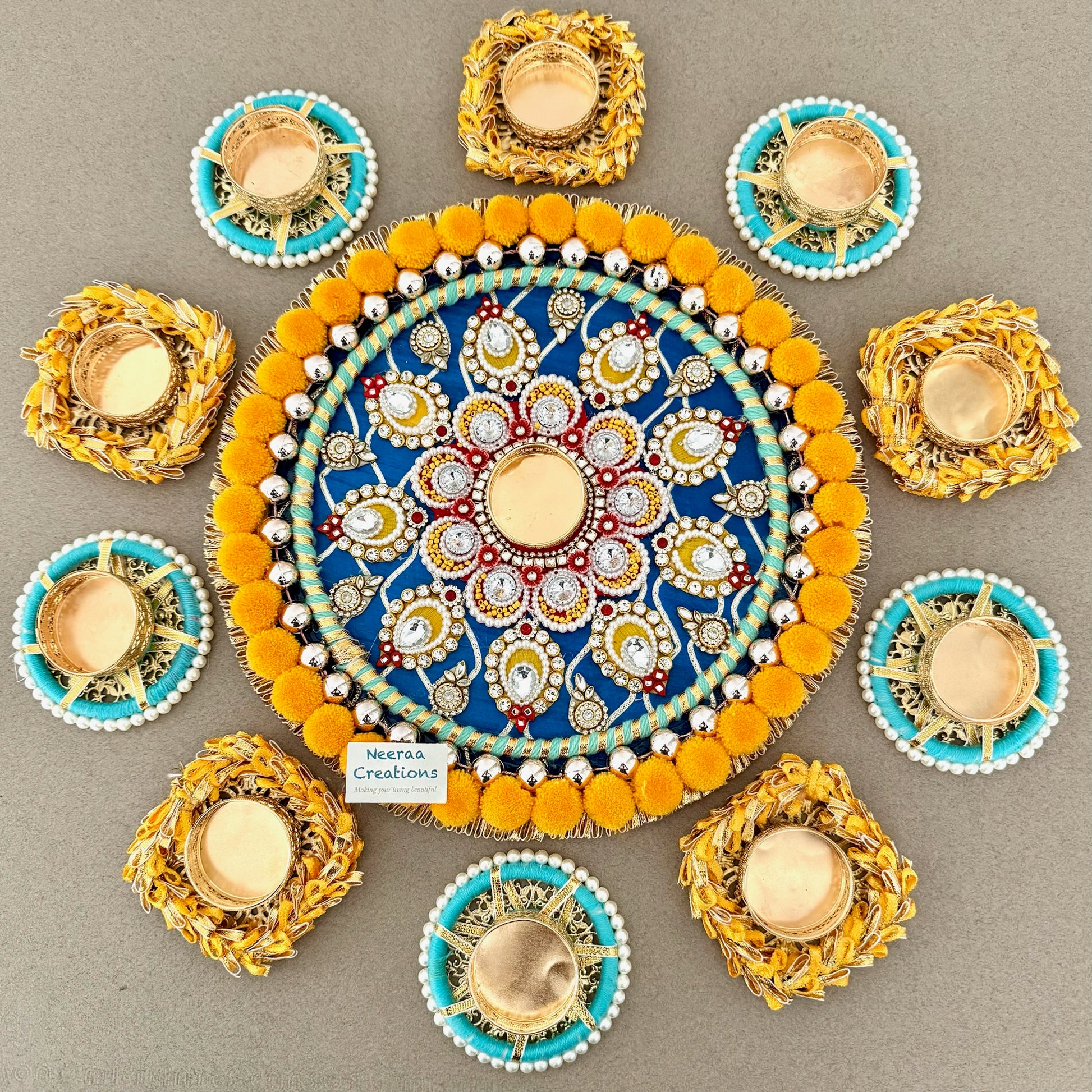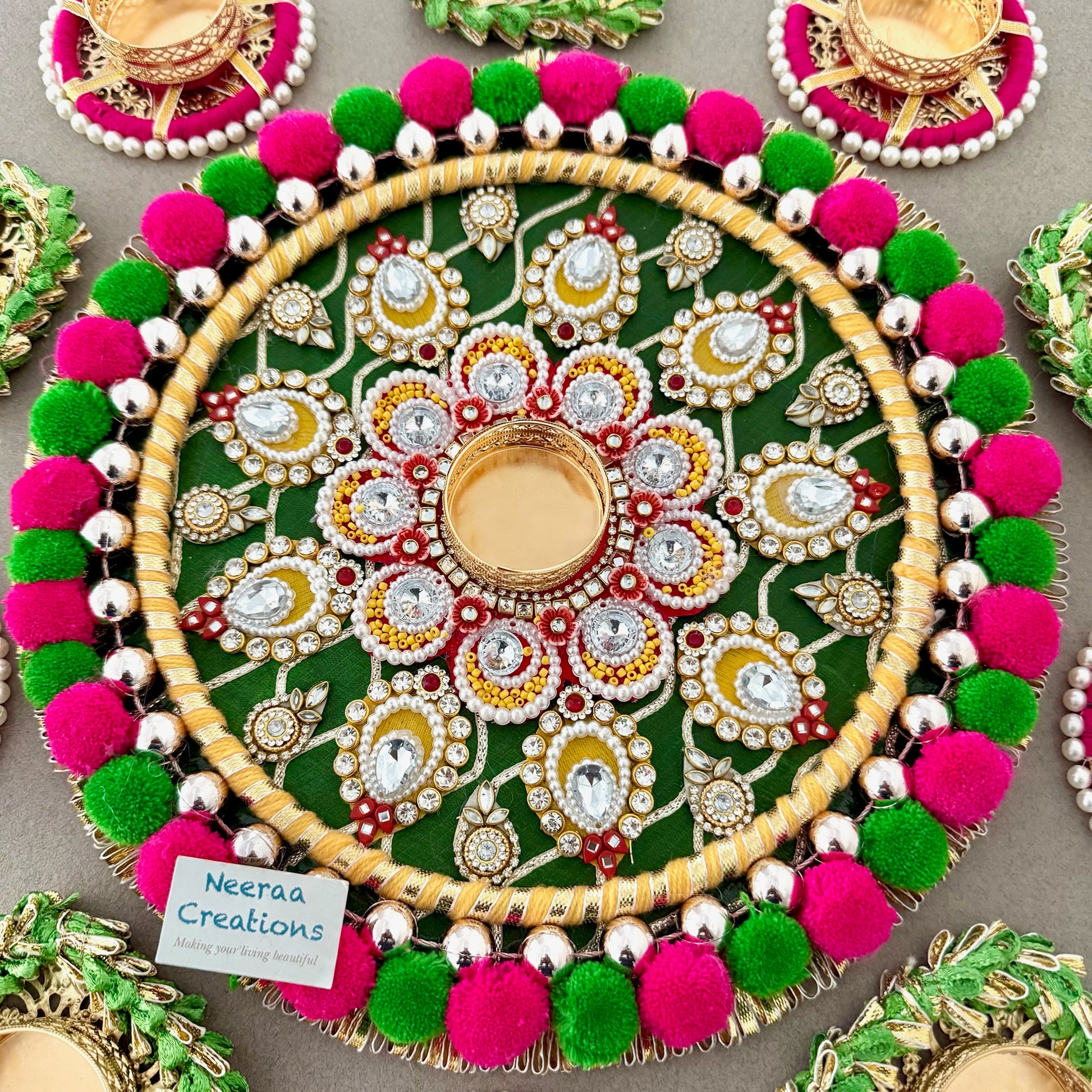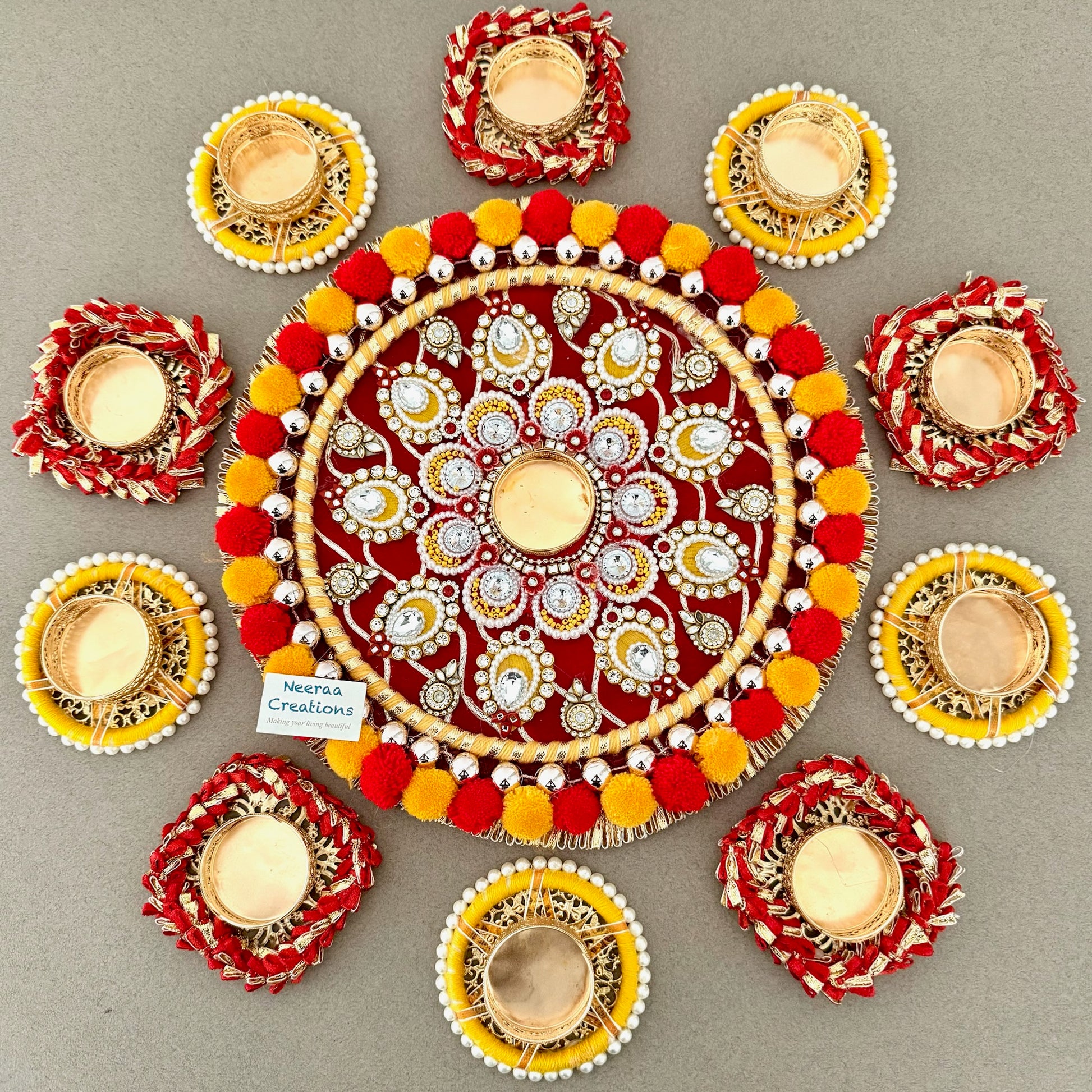 This exclusive Diwali decoration set from Neeraa Creations features a stunning centerpiece adorned with intricate stones and bead work, surrounded by coordinated decorative tealight holders. This Rangoli centerpiece showcases symmetrical floral patterns, sparkling stones, metallic beads, and vibrant pom-poms, with various color themes for a festive and elegant look