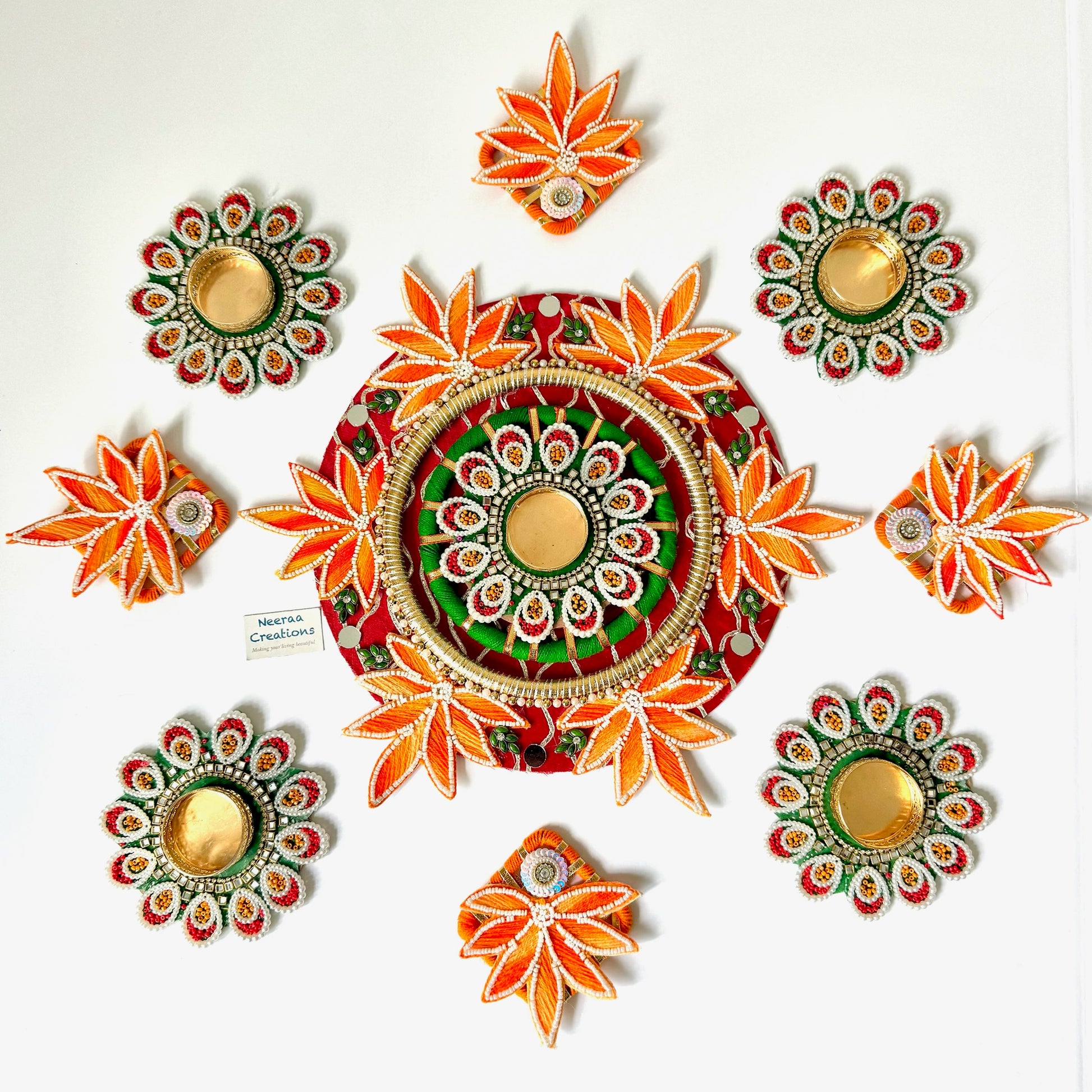 Bring home this exquisite set by Neeraa Creations and make your living beautiful with a splash of tradition and style.