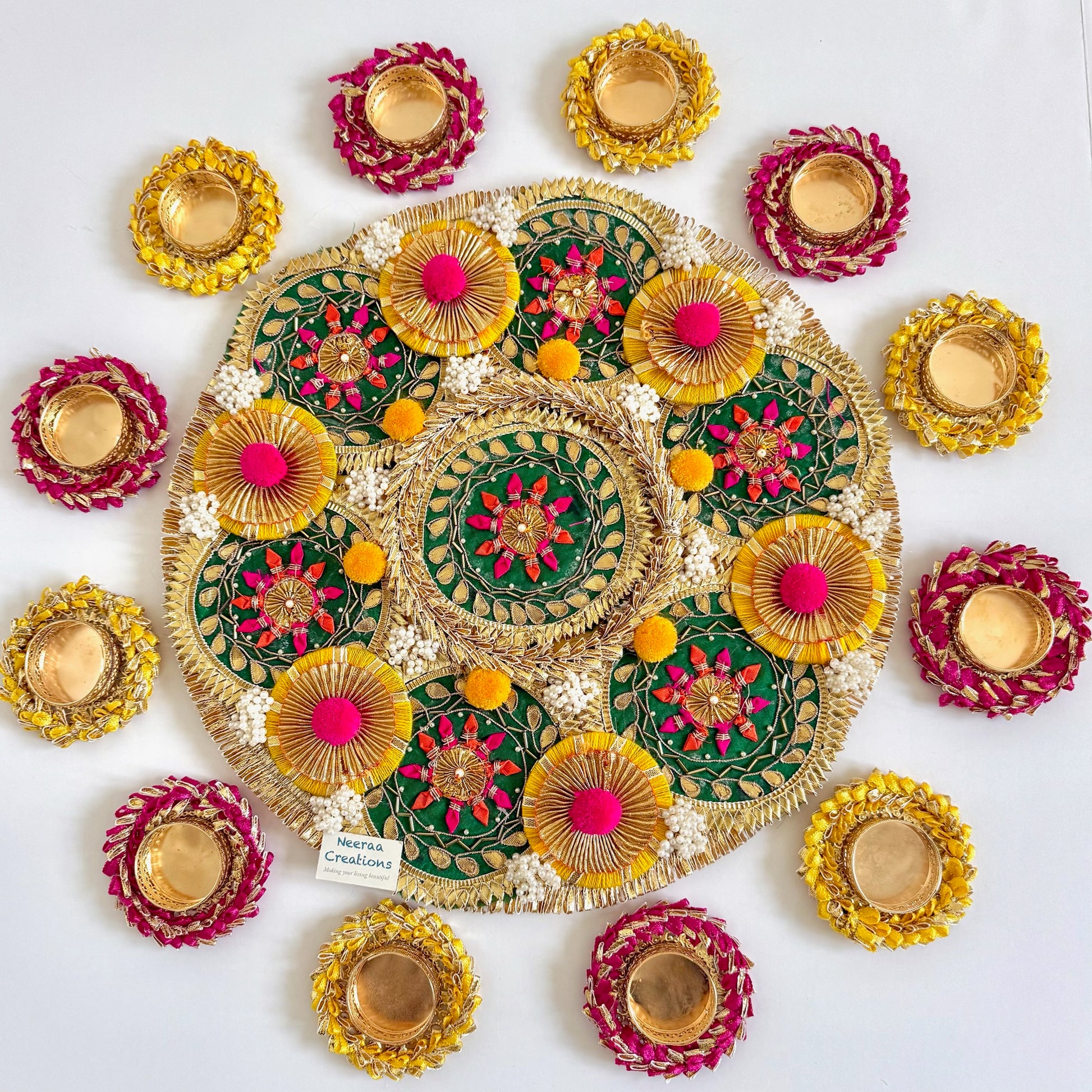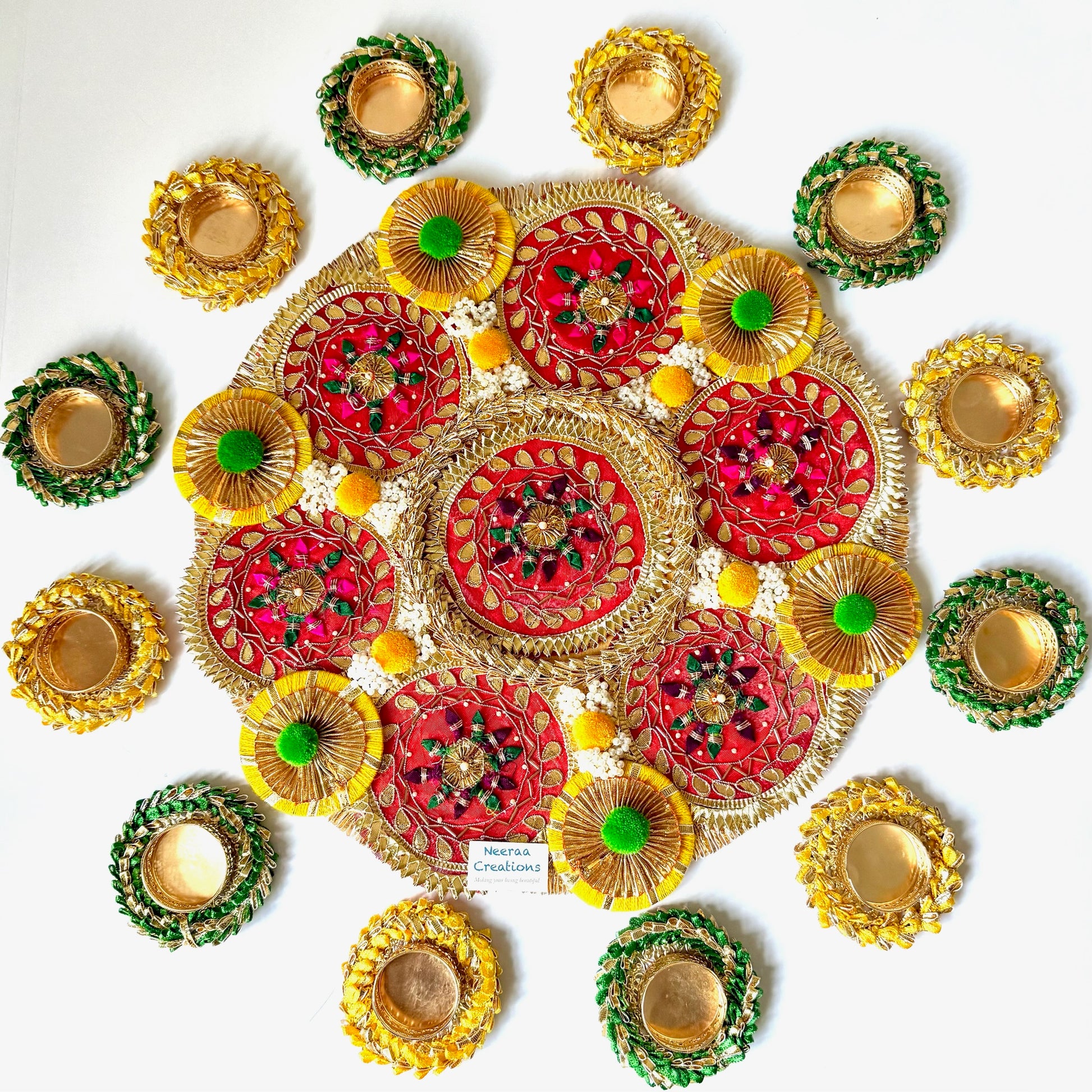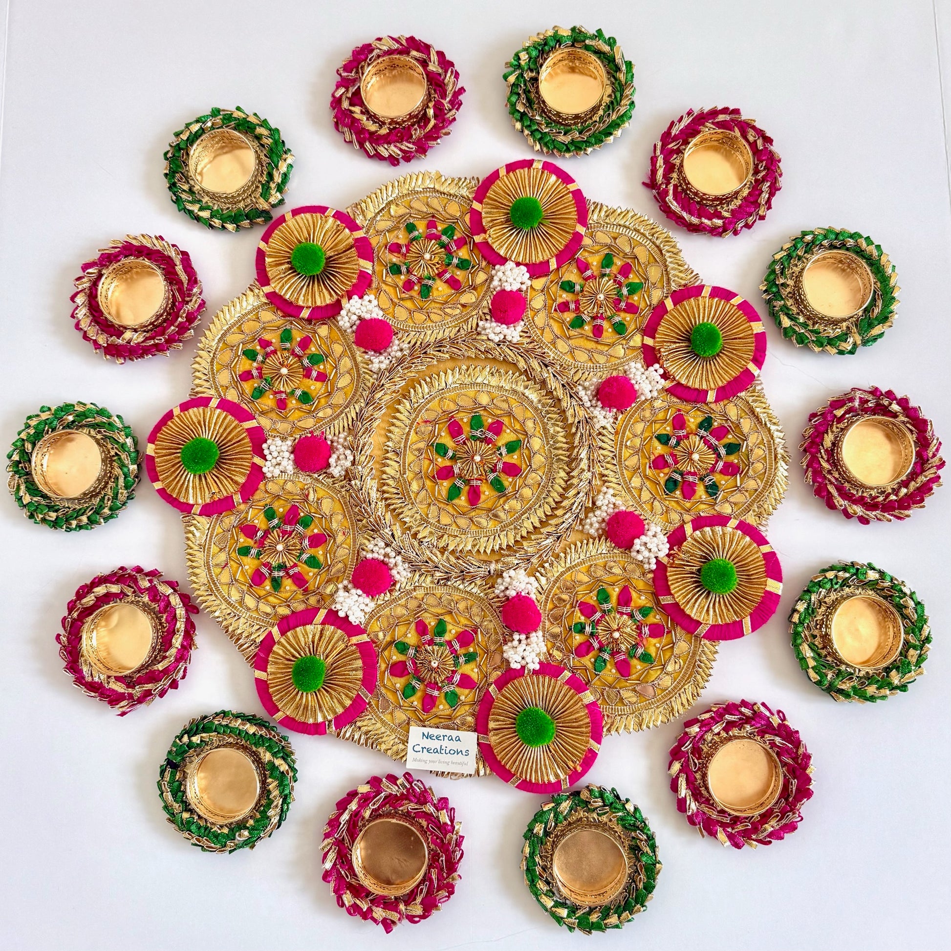 - Includes matching decorative diyas, artistically wrapped in colorful threads, beads to complement the central design.