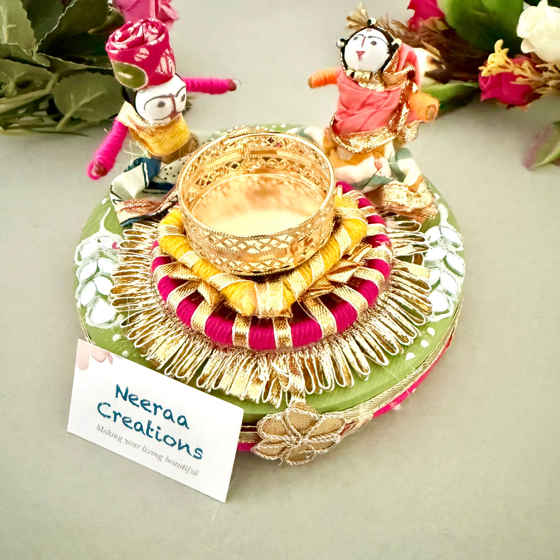 This tea light holder by Neeraa Creations is a vibrant, handcrafted decorative piece that beautifully features a traditional puppet couple, symbolizing Indian culture and festivity. The holder consists of a round, multi-layered base in bright shades. At the center is a detailed golden metal holder, perfectly sized for a standard battery tea light, adding elegance and a festive glow.