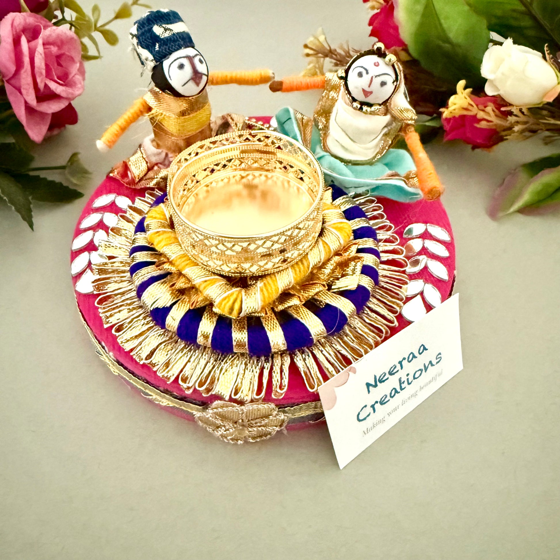 The highlight of this design is the charming puppet couple seated on the base—a male and female figure dressed in colorful, traditional attire, representing the cultural heritage of Indian puppetry. These miniatures not only add a whimsical and artistic touch but also make the holder a perfect centerpiece for Diwali, weddings, pooja décor, or as a meaningful gift. Every holder is meticulously embellished with decorative motifs, reflecting the artistry.